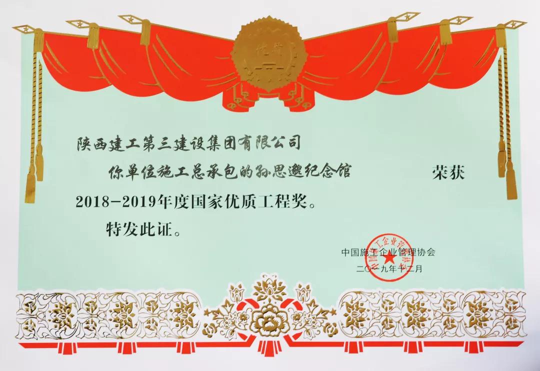 12月8日,2019年國家優質工程獎總結表彰大會在北京國家會議中心召開,由集團公司承建的孫思邈紀念館工程榮獲2018-2019年度國家優質工程獎,這是繼集團公司延安棗園文化廣場一期一標段工程榮獲2017年國優獎后,獲得的第10項國家優質工程獎。